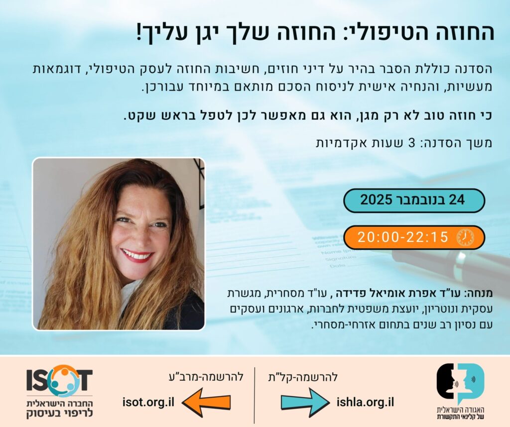 הצטרפו לסדנה מקוונת ייחודית שתעניק לכם את כל הידע והכלים לכתיבה וניהול של חוזה טיפולי ברור ומקצועי.